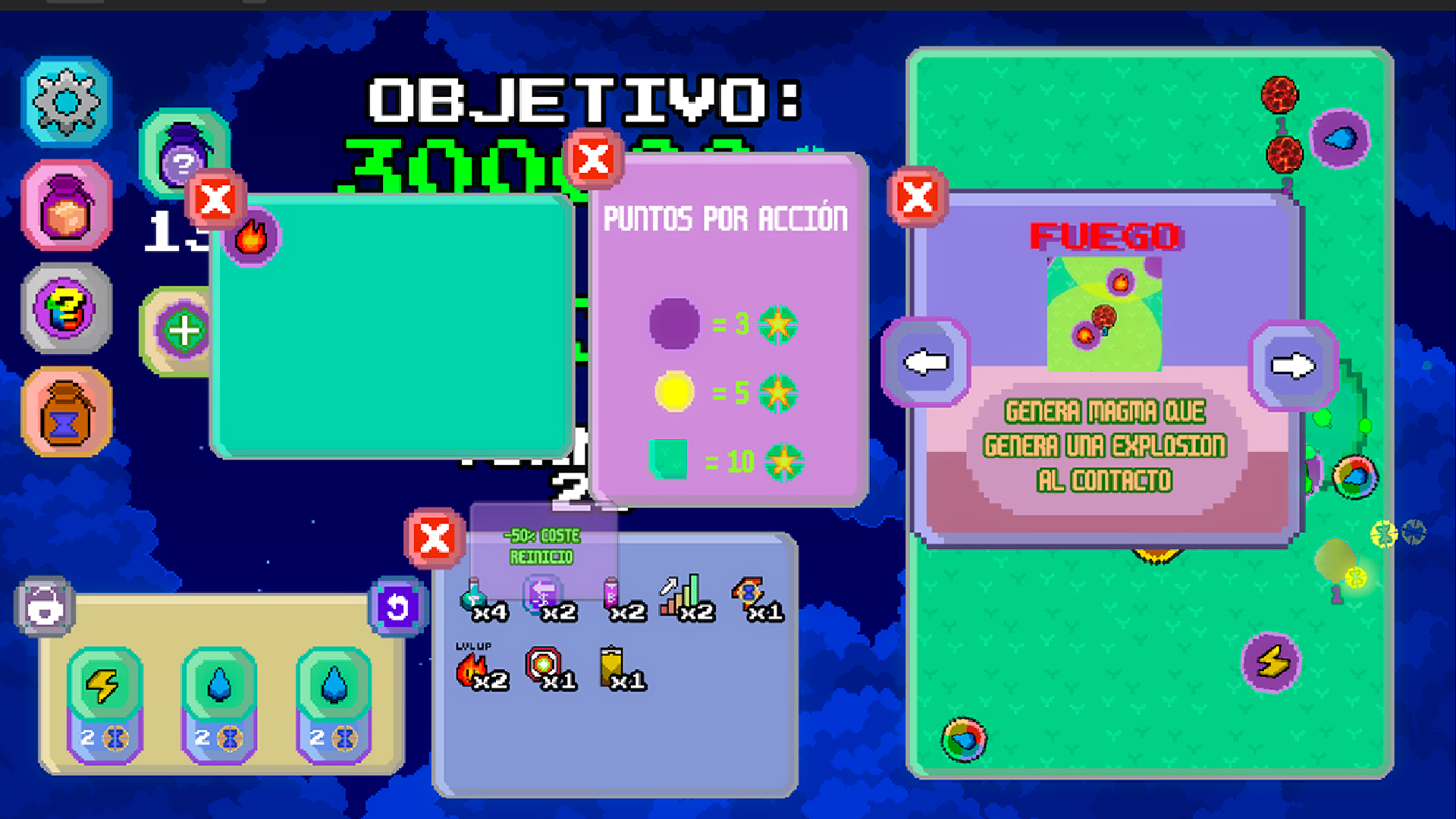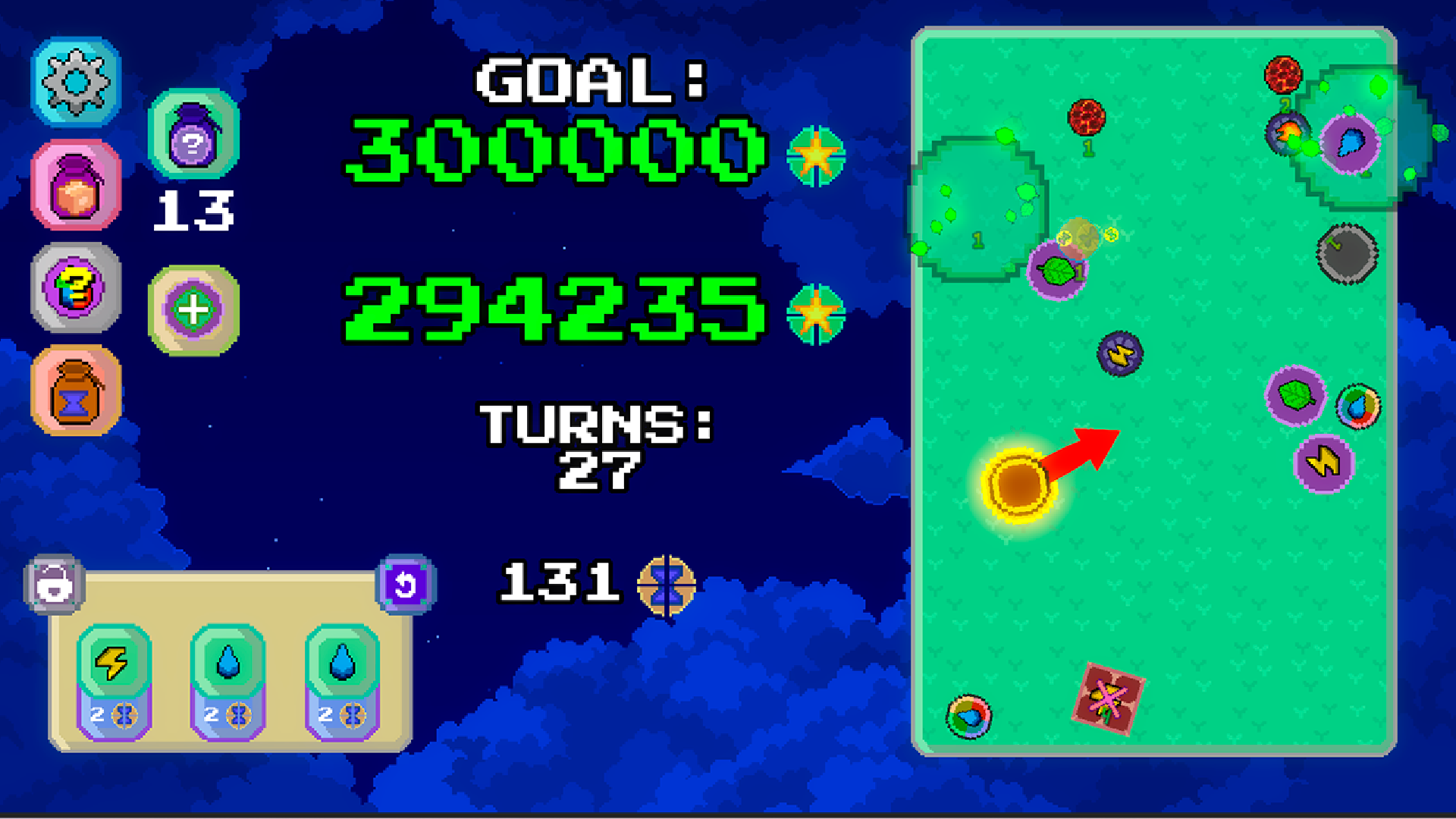 The game is turn-based. When you drag a token reduces your available actions. On the field, there are multiple tokens. Every token can have one of this five elements (NONE, FIRE, ELECTRICITY, WATER or PLANT), each represented by the icon in its center.